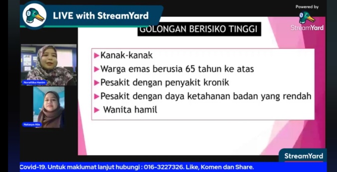 • Memberi kesedaran kepada masyarakat tentang risiko Covid-19 kepada warga emas, wanita hamil, kanak-kanak dan juga pesakit yang mempunyai penyakit kronik