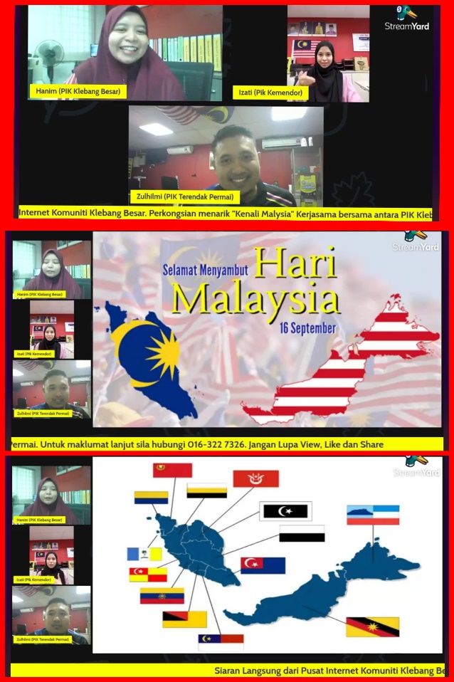 Pusat Internet Komuniti Klebang Besar telah menganjurkan sebuah program bual bicara bersempena sambutan Hari Malaysia bertajuk ‘Kenali Malaysia Kita’ yang berdurasi selama 1 jam. Salah satu inisiatif program ini diadakan bertujuan untuk menghayati dengan lebih mendalam makna disebalik tarikh penting 16 September 1963,